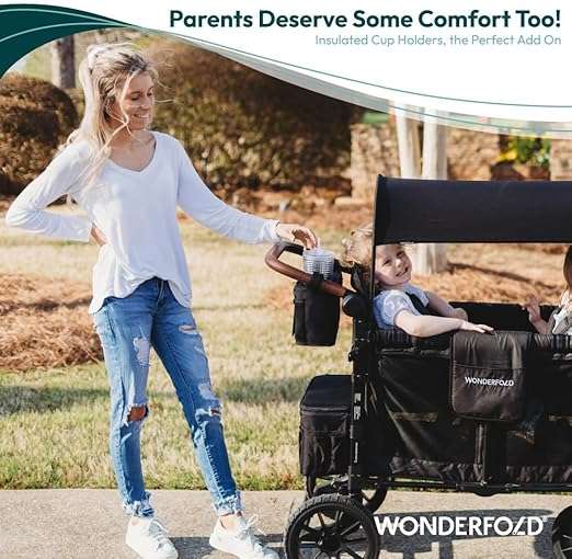 WONDERFOLD Universal Parent Console Stroller Organizer with Insulated Cup Holders, Hook & Loop Closure Handle Attachment, 2 Storage Pockets, Removable Shoulder Strap for Easy Transport